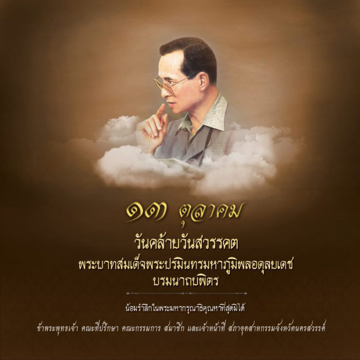 …………………………………… @ อีกหนึ่งวันสำคัญในเดือนนี้คือวันที่ 13 ตุลาคม วันคล้ายวันสวรรคตพระบาทสมเด็จพระปรมินทรมหาภูมิพลอดุลยเดช บรมนาถบพิตร (ในหลวง รัชกาลที่ 9) ทรงมีพระราชกรณียกิจมากมาย อาทิ โครงการแกล้งดิน, โครงการแก้มลิง, โครงการปลูกหญ้าแฝก, โครงการหน่วยแพทย์พระราชทาน , โครงการสารานุกรมไทยสำหรับเยาวชน, ทุนมูลนิธิอานันทมหิดล, แนวคิดเศรษฐกิจพอเพียง : เกษตรทฤษฎีใหม่, โครงการส่วนพระองค์สวนจิตรลดา, โครงการฝนหลวง และอีกหลากหลายโครงการนับไม่ถ้วน เพื่อประชาชนชาวไทย พระองค์ทรงเป็นพระมหากษัตริย์ผู้เปี่ยมล้นไปด้วยพระมหากรุณาธิคุณอันหาที่สุดมิได้ เพื่อน้อมรำลึกถึงพระมหากรุณาธิคุณของพระองค์ที่ได้ทรงบำเพ็ญพระราชกรณียกิจอันเป็นประโยชน์ยิ่งต่อปวงชนชาวไทย ขอเชิญชาวไทยทุกคนเข้าวัดทำบุญ ตักบาตร เป็นจิตอาสา ถวายเป็นพระราชกุศลแด่พระองค์