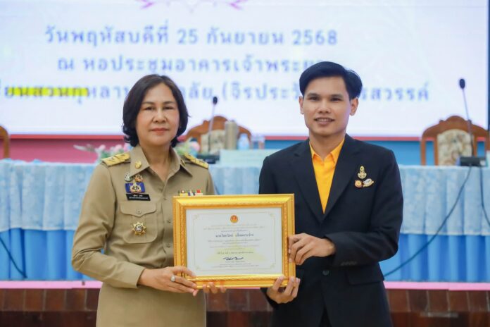 ไชยวัตน์ เอี่ยมกระจ่าง อาจารย์วิทยาลัยอาชีวศึกษาวิริยาลัยนครสวรรค์ ศิษย์เก่ามหาวิทยาลัยเจ้าพระยา รับมอบเกียรติบัตรจาก ชุติพร เสชัง ผู้ว่าราชการจังหวัดนครสวรรค์ ในโอกาสที่ได้รับรางวัลชมเชย “บุคคลต้นแบบทำความดีเพื่อแผ่นดิน วุฒิสภา” จากคณะกรรมาธิการการพัฒนาสังคม และกิจการเด็ก เยาวชน สตรี ผู้สูงอายุ คนพิการ ผู้ด้อยโอกาส และความหลากหลายทางสังคม วุฒิสภา ในที่ประชุมกรมการจังหวัด เมื่อวันพฤหัสบดีที่ 25 กันยายน 2568 ณ หอประชุมโรงเรียนสวนกุหลาบวิทยาลัย (จิรประวัติ) จังหวัดนครสวรรค์