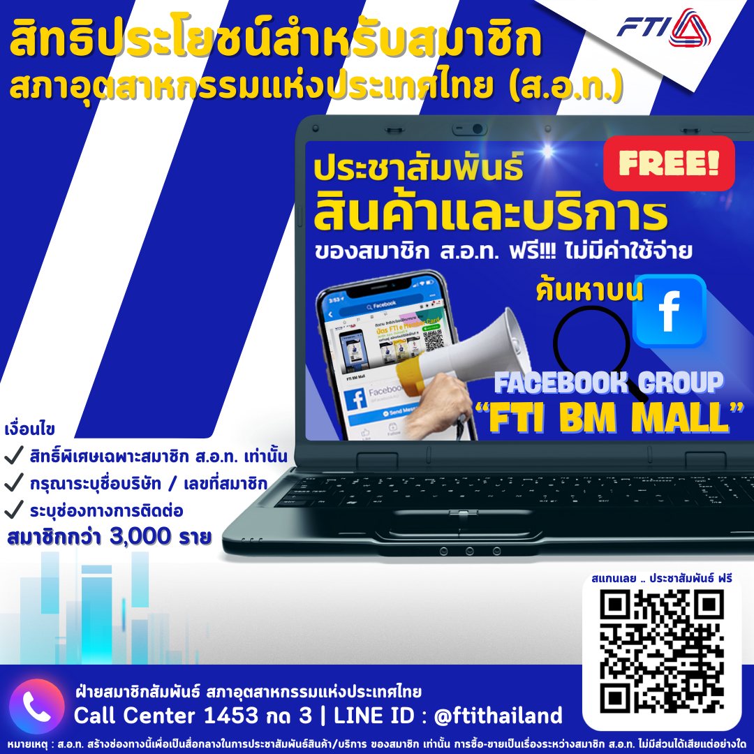 ขอเชิญสมาชิกเข้าร่วม “FTI BM MALL” ชุมชนการค้าออนไลน์แบบ Exclusive ที่ออกแบบมาเพื่อสมาชิก ส.อ.ท. โดยเฉพาะ เพื่อสร้าง “Digital Hub” ที่สามารถ : โพสต์ขายและหาซื้อ : สินค้า/บริการที่ต้องการได้จากคนในวงการโดยตรง / สร้างความเชื่อมั่น: ซื้อขายกับบริษัทที่ผ่านการรับรองจาก ส.อ.ท. / อัปเดต Insight: ข่าวสารอุตสาหกรรมและโอกาสทางธุรกิจก่อนใคร
