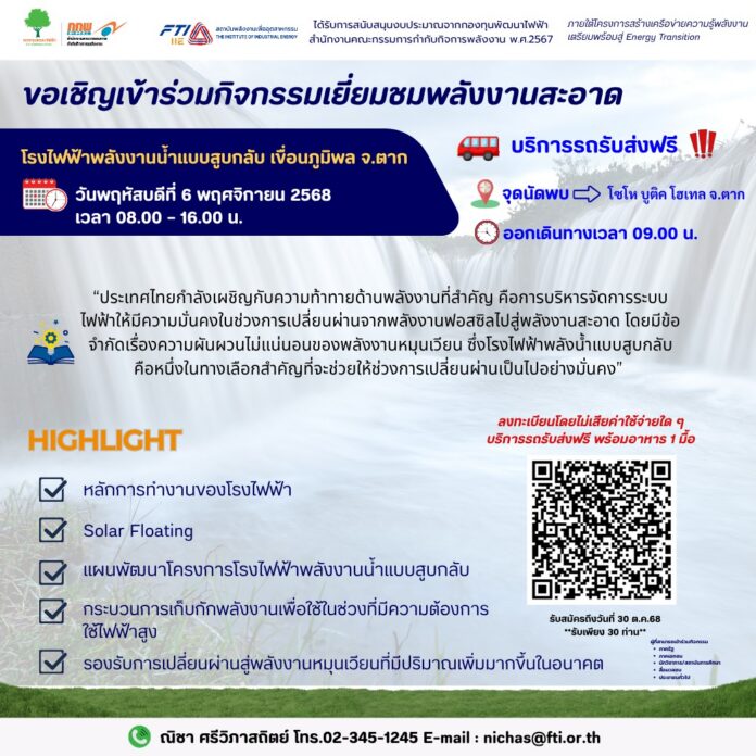 ผู้อ่านสวรรค์นิวส์และสมาชิกสภาอุตสาหกรรมจังหวัดนครสวรรค์…………………………………….. @ ขอเชิญเข้าร่วมกิจกรรมเยี่ยมชมโรงไฟฟ้าพลังงานน้ำแบบสูบกลับ เขื่อนภูมิพล จังหวัดตาก ในวันพฤหัสบดีที่ 6 พฤศจิกายน 2568 เวลา 08.00 – 16.30 นาฬิกา Highlight กิจกรรม รับฟังหลักการทำงานโรงไฟฟ้า แผนพัฒนาโครงการโรงไฟฟ้าพลังงานน้ำแบบสูบกลับ กระบวนการกักเก็บพลังงานเพื่อใช้ช่วงทีมีความต้องการไฟฟ้าสูง รองรับการเปลี่ยนผ่านสู่พลังงานหมุนเวียน ลงทะเบียนฟรี! เปิดรับจำนวนจำกัดเพียง 30 ท่าน ลงทะเบียน https://docs.google.com/…/1FAIpQLSdEPCOiD5U…/viewform… สอบถามรายละเอียดเพิ่มเติมได้ที่ น.ส.ณิชา ศรีวิภาสถิตย์ โทร. 02-345-1245 ดำเนินการโดยสภาอุตสาหกรรมแห่งประเทศไทย ได้รับการสนับสนุนจากกองทุนพัฒนาไฟฟ้า สำนักงานคณะกรรมการกำกับกิจการพลังงาน พ.ศ.2567