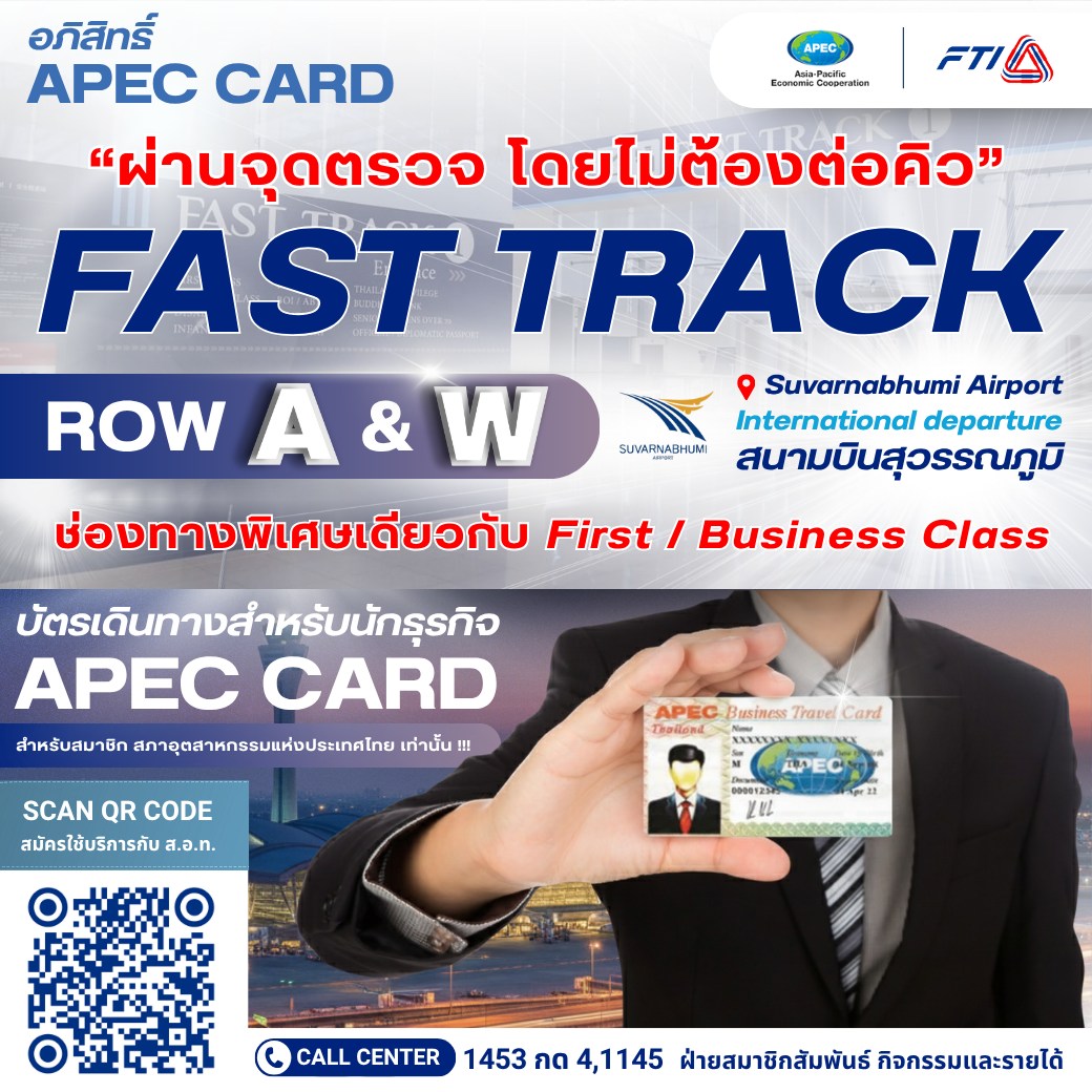 …………………………………… @ บัตรเดินทางสำหรับนักธุรกิจ APEC CARD อภิสิทธิ์เหนือระดับ ด้วย FAST TRACK!!! ผ่านจุดตรวจโดยไม่ต้องต่อคิว เหมือนผู้โดยสาร First / Business Class สนามบินสุวรรณภูมิ (ขาออกระหว่างประเทศ) ใช้ช่องทางพิเศษ FAST TRACK – Row A & W สมัครผ่าน สภาอุตสาหกรรมแห่งประเทศไทย (ส.อ.ท.) ได้แล้ววันนี้!
