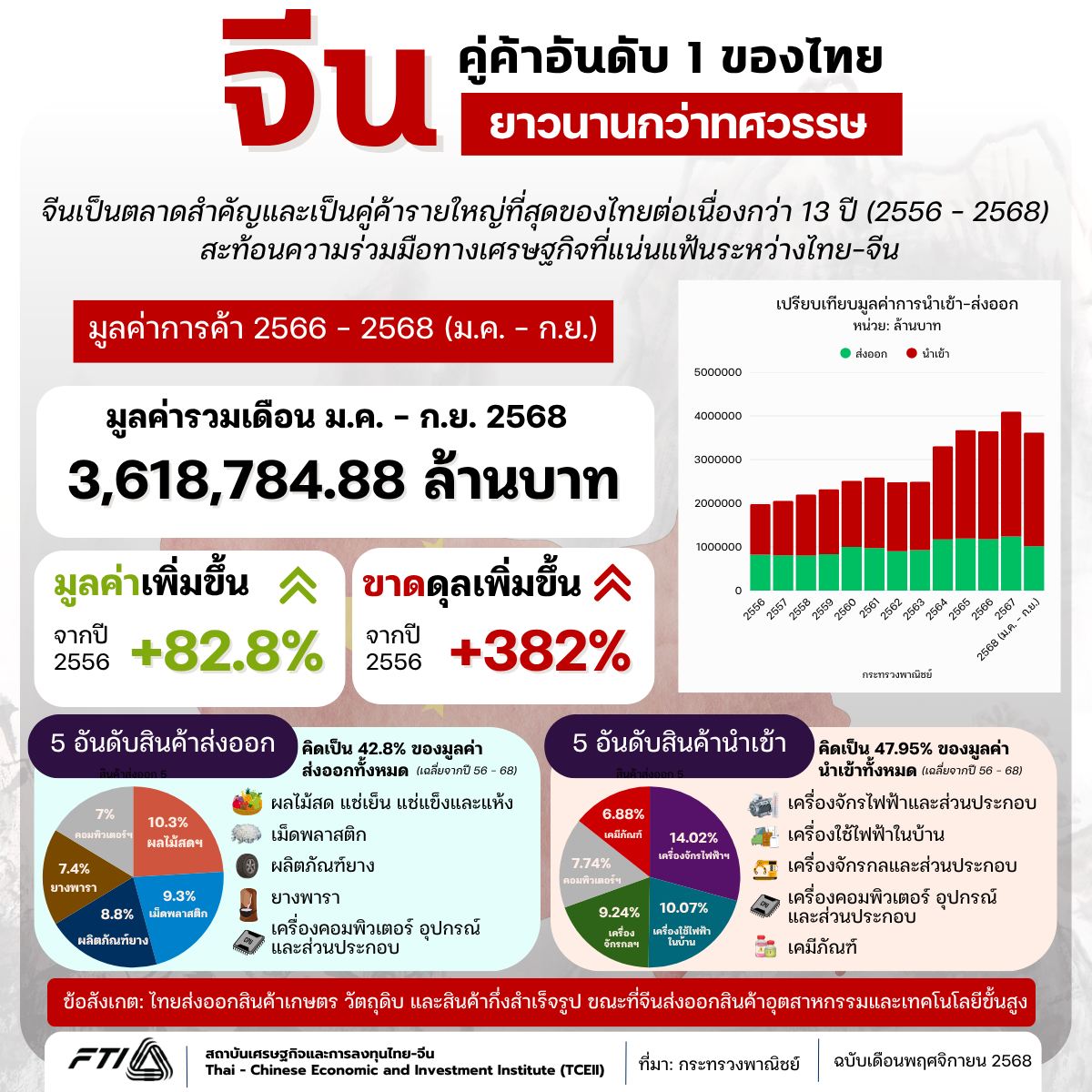 …………………………………….. @ จีน คู่ค้าอันดับ 1 ของไทยยาวนานกว่าทศวรรษ จีนยังคงเป็นคู่ค้ารายใหญ่ที่สุดของประเทศไทยอย่างต่อเนื่องมายาวนานกว่า 13 ปี ตั้งแต่ปี 2556 จนถึงปัจจุบัน สะท้อนถึงความสัมพันธ์ทางเศรษฐกิจที่แน่นแฟ้นและการเติบโตของการค้าในทุกมิติ ข้อมูลจากกระทรวงพาณิชย์ระบุว่ามูลค่าการค้ารวมระหว่างไทย–จีนในปี 2568 (มกราคม–กันยายน) อยู่ที่กว่า 3.62 ล้านล้านบาท เพิ่มขึ้นจาก 1.98 ล้านล้านบาท ในปี 2556 คิดเป็นการขยายตัว 82.8% ตลอดช่วง 13 ปีที่ผ่านมา อย่างไรก็ตาม ไทยยังคงขาดดุลการค้ากับจีนเพิ่มขึ้นอย่างต่อเนื่อง จาก 330,624 ล้านบาท ในปี 2556 เป็นประมาณ 1.59 ล้านล้านบาท ในปี 2568 (มกราคม–กันยายน) เพิ่มขึ้นกว่า 382% ซึ่งสะท้อนถึงการพึ่งพาการนำเข้าจากจีนในหลายหมวดสินค้า