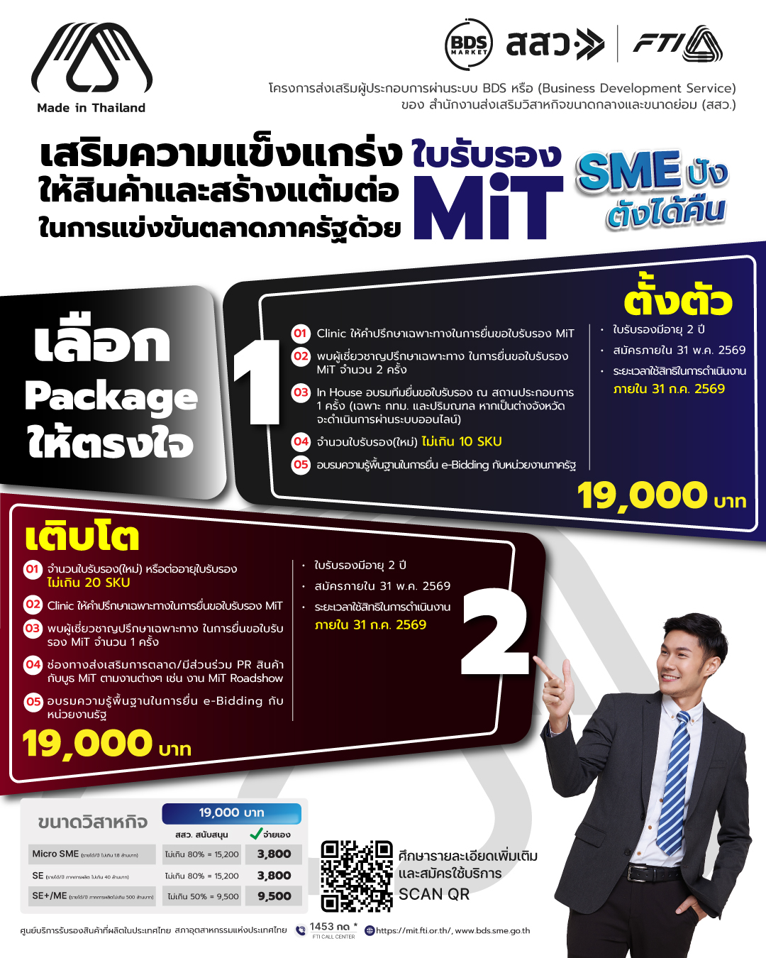 …………………………………….. @ SME ไทยต้องรอด! รับรองสินค้า Made in Thailand (MiT) เพิ่มแต้มต่อและโอกาสพิชิตตลาดภาครัฐ พร้อมรับเงินสนับสนุนสูงสุดถึง 80% จาก สสว. ผู้ประกอบการที่ค้าขายกับภาครัฐและต้องการเพิ่มแต้มต่ออีก 5% สามารถขอรับรองสินค้า MiT โดยเข้าร่วมโครงการ “SME ปัง ตังได้คืน” ภายใต้โครงการของสำนักงานส่งเสริมวิสาหกิจขนาดกลางและขนาดย่อม (สสว.) ผ่านระบบ BDS รับเงินสนับสนุนค่าบริการและการออกใบรับรอง MiT สูงสุด 80% (มูลค่าสูงสุดต่อราย 12,000 บาท) ระยะเวลาใช้สิทธิ์ในการดำเนินงาน ตั้งแต่วันนี้ – 31 กรกฎาคม 2569 (นับตั้งแต่วันสมัครแพ็กเกจ) SME ที่สนใจลงทะเบียนโครงการ “SME ปัง ตังได้คืน” ได้ที่ https://bds.sme.go.th และสามารถขอใบเสนอราคาได้ที่ https://bds.sme.go.th/Service/Detail/514 สอบถามข้อมูลเพิ่มเติมเรื่องการออกใบรับรอง MiT คุณนุชเนตร โทร. 02-345-1244 หรือ Line OA: @mitofficial