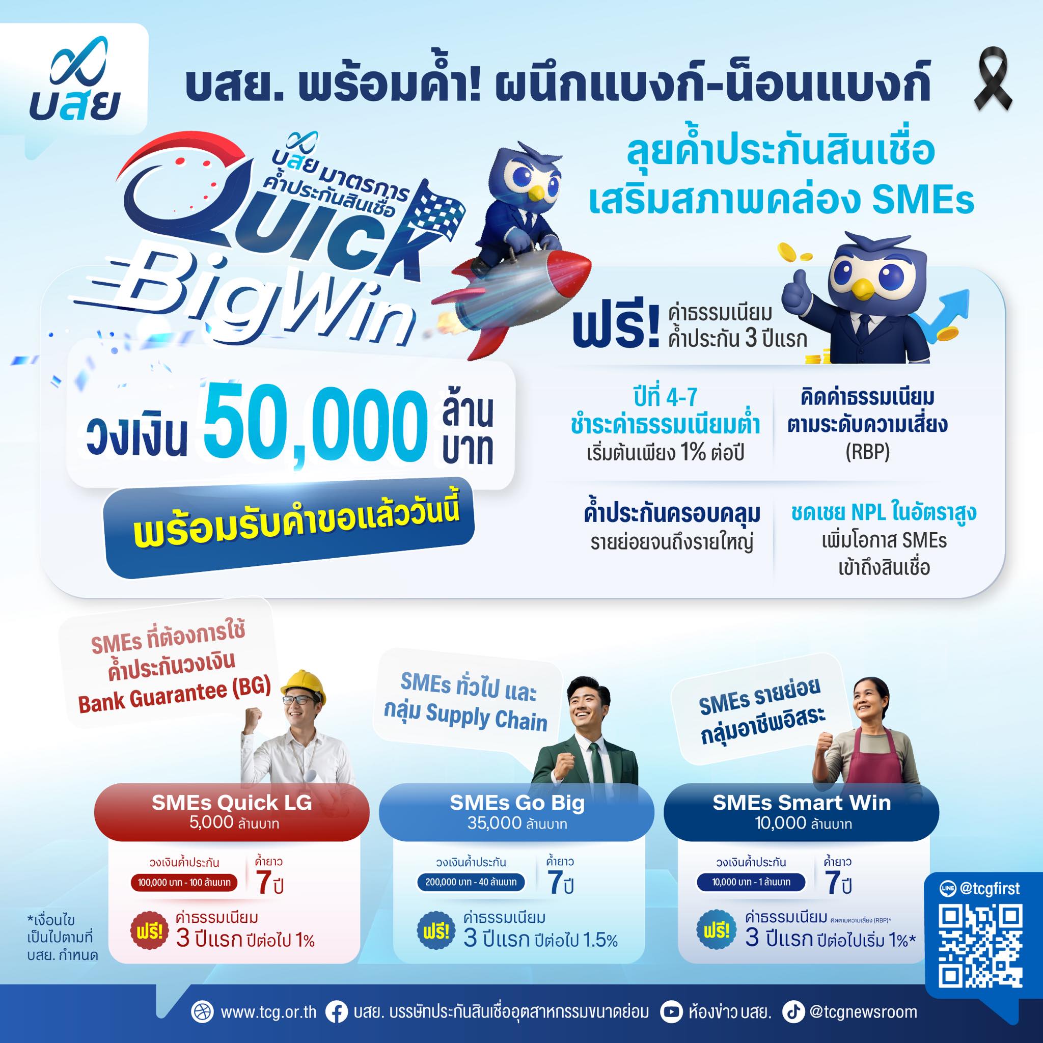 …………………………………….. @ บสย. พร้อมค้ำ ผนึกแบงก์-น็อนแบงก์ ลุยค้ำประกันสินเชื่อ “บสย. Quick Big Win” เร่งเสริมสภาพคล่อง SMEs นายสิทธิกร ดิเรกสุนทร กรรมการและผู้จัดการทั่วไป บรรษัทประกันสินเชื่ออุตสาหกรรมขนาดย่อม (บสย.) เปิดเผยว่า จากข้อมูลของธนาคารแห่งประเทศไทย ที่ระบุถึงสินเชื่อ SMEs ที่หดตัวต่อเนื่อง โดยติดลบติดต่อกันถึง 13 ไตรมาสที่ผ่านมา สาเหตุจากความเสี่ยงด้านเครดิตสูงและปัญหาเชิงโครงสร้างที่ต้องปรับเพิ่มความสามารถในการแข่งขันระยะยาว สะท้อนถึงปัญหาของ SMEs ที่ไม่สามารถเข้าไม่ถึงสินเชื่อในระบบได้ เป็นที่มาของการเปิดตัว มาตรการค้ำประกันสินเชื่อ “บสย. Quick Big Win” นโยบายของรัฐบาล โดยกระทรวงการคลัง ซึ่งคณะรัฐมนตรีให้ความเห็นชอบ เมื่อวันที่ 2 ธันวาคม 2568 ที่ผ่านมา เพื่อเข้ามาเติมสภาพคล่องให้ SMEs อย่างเร่งด่วน