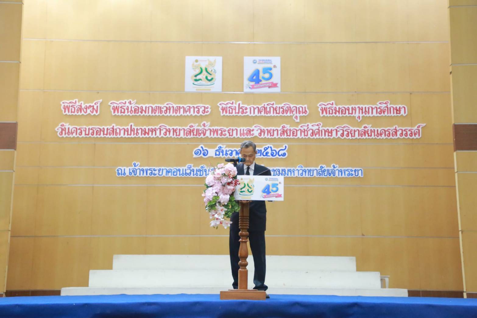 หลังจากนั้นเป็นพิธีสงฆ์ พิธีเปิดงานวันครบรอบสถาปนาฯ โดยนายปรีชา อรรถวิภัชน์ นายกสภามหาวิทยาลัย ให้เกียรติเป็นประธานในพิธีฯ โดยมี ดร.ดารัตน์ ศิริวิริยะกุล วิภาตะกลัศ อธิการบดีมหาวิทยาลัยเจ้าพระยา เป็นผู้กล่าวรายงานผลการดำเนินงานของมหาวิทยาลัยเจ้าพระยาในรอบปีที่ผ่านมาเนินงานของมหาวิทยาลัยเจ้าพระยาในรอบปีที่ผ่านมา ต่อเนื่องด้วยพิธีเฉลิมฉลองวันครบรอบการสถาปนาฯ พิธีน้อมกตเวทิตาคารวะคุณพ่อจรูญ ศิริวิริยะกุล ท่านผู้ก่อตั้งมหาวิทยาลัยเจ้าพระยา นายกสภามหาวิทยาลัย กรรมการสภามหาวิทยาลัยเจ้าพระยา อธิการบดีกิตติคุณ ประธานเจ้าหน้าที่บริหาร KTIS GROUP และอธิการบดีมหาวิทยาลัยเจ้าพระยา