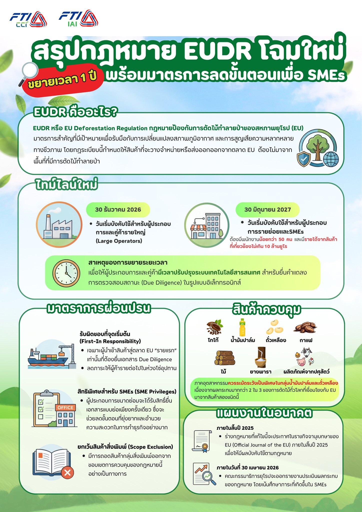 …………………………………… @ ข่าวดีสำหรับ SMEs และผู้ประกอบการในห่วงโซ่อุปทานกฎหมาย EUDR โฉมใหม่ของสหภาพยุโรป มุ่งลดภาระและเพิ่มความยืดหยุ่นในการปฏิบัติตามกฎหมาย กลุ่มสินค้าที่อยู่ในขอบเขต EUDR โกโก้ น้ำมันปาล์ม ถั่วเหลือง กาแฟ ไม้ ยางพารา และผลิตภัณฑ์จากปศุสัตว์