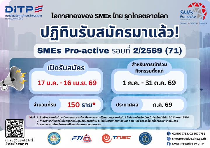 โครงการ SMEs Pro-active รอบที่ 2/2569 (71) รับสมัครจำนวน 150 ราย สมัครได้ตั้งแต่วันที่ 17 มกราคม – 16 เมษายน 2569 (หรือปิดรับทันทีเมื่อใบสมัครครบจำนวน) กำหนดการเข้าร่วมกิจกรรม ระหว่างวันที่ 1 กรกฎาคม – 31 ตุลาคม 2569 แจ้งผลการอนุมัติเดือนกรกฎาคม 2569