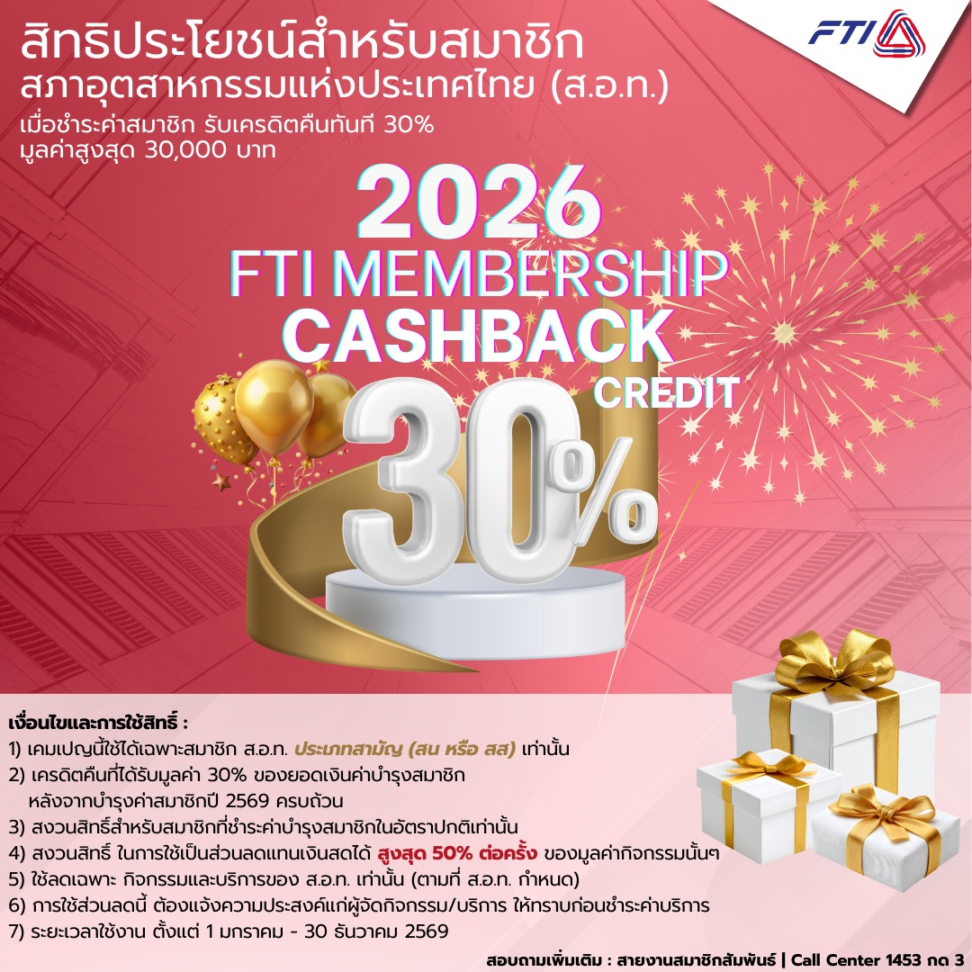 FTI Membership Cashback 30% ของยอดเงินค่าบำรุงสมาชิก สามารถนำไปใช้เป็นส่วนลดสูงสุด 50% เพื่อใช้เป็นส่วนลดในกิจกรรมและบริการต่างๆ ของหน่วยงานภายใน ส.อ.ท. ปี 2569