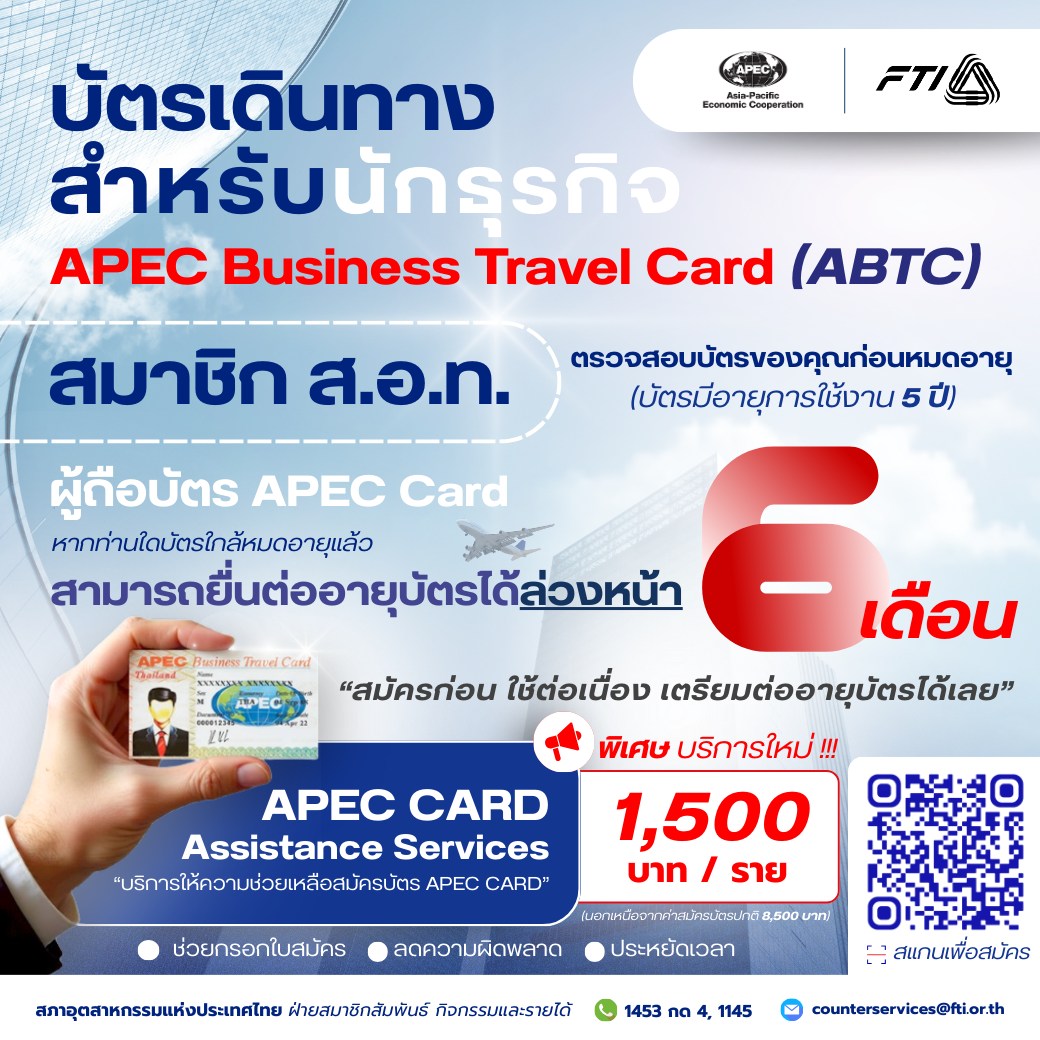 …………………………………… @ บัตร APEC CARD ใกล้หมดอายุหรือไม่? ต่ออายุล่วงหน้าได้ เดินทางต่อเนื่อง ไม่มีสะดุด บัตร APEC CARD อายุ 5 ปี ต่ออายุล่วงหน้าได้สูงสุด 6 เดือน บริการใหม่จากสภาอุตสาหกรรมแห่งประเทศไทย (ส.อ.ท.) (FTI) APEC CARD Assistance Services
