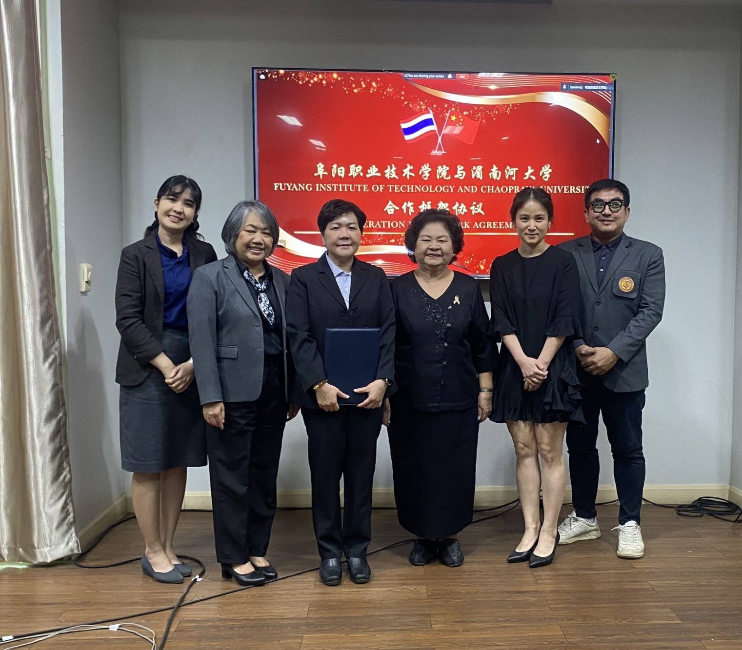ดร.ดารัตน์ ศิริวิริยะกุล วิภาตะกลัศ  อธิการบดีมหาวิทยาลัยเจ้าพระยา พร้อมด้วยคณะผู้บริหาร ได้ร่วมพิธีลงนามบันทึกข้อตกลงความร่วมมือทางวิชาการ (Memorandum of Understanding: MOU) ร่วมกับ Fuyang Institute of Technology สาธารณรัฐประชาชนจีน โดย ผู้ช่วยศาสตราจารย์ ดร. Wenqing Hao อธิการบดีและรองเลขาธิการคณะกรรมการพรรคคอมมิวนิสต์แห่งสาธารณรัฐประชาชนจีน พร้อมด้วยคณะผู้บริหาร ได้ให้เกียรติเข้าร่วมในพิธีดังกล่าว ซึ่งนับเป็นก้าวสำคัญในการเริ่มต้นความร่วมมือทางวิชาการระหว่างสองสถาบันอย่างเป็นทางการ เมื่อวันพุธที่ 14 มกราคม พ.ศ. 2569  ณ ห้องรับรองริมน้ำ ศูนย์ประชุมมหาวิทยาลัยเจ้าพระยา ภายใต้กรอบความร่วมมือนี้ ทั้งสองสถาบันได้กำหนดจัดกิจกรรมทางวิชาการร่วมกัน โดยกิจกรรมแรกคือ โครงการอบรมทักษะอากาศยานไร้คนขับ (Drone Skills Training Program) ซึ่งจะจัดขึ้น ณ มหาวิทยาลัยเจ้าพระยา ในช่วงเดือนมีนาคม พ.ศ. 2569 ทั้งนี้ ผู้เข้ารับการอบรมจะได้รับ ใบประกาศนียบัตร (Certificate) จาก Fuyang Institute of Technology และมหาวิทยาลัยเจ้าพระยาภายหลังสำเร็จการอบรม