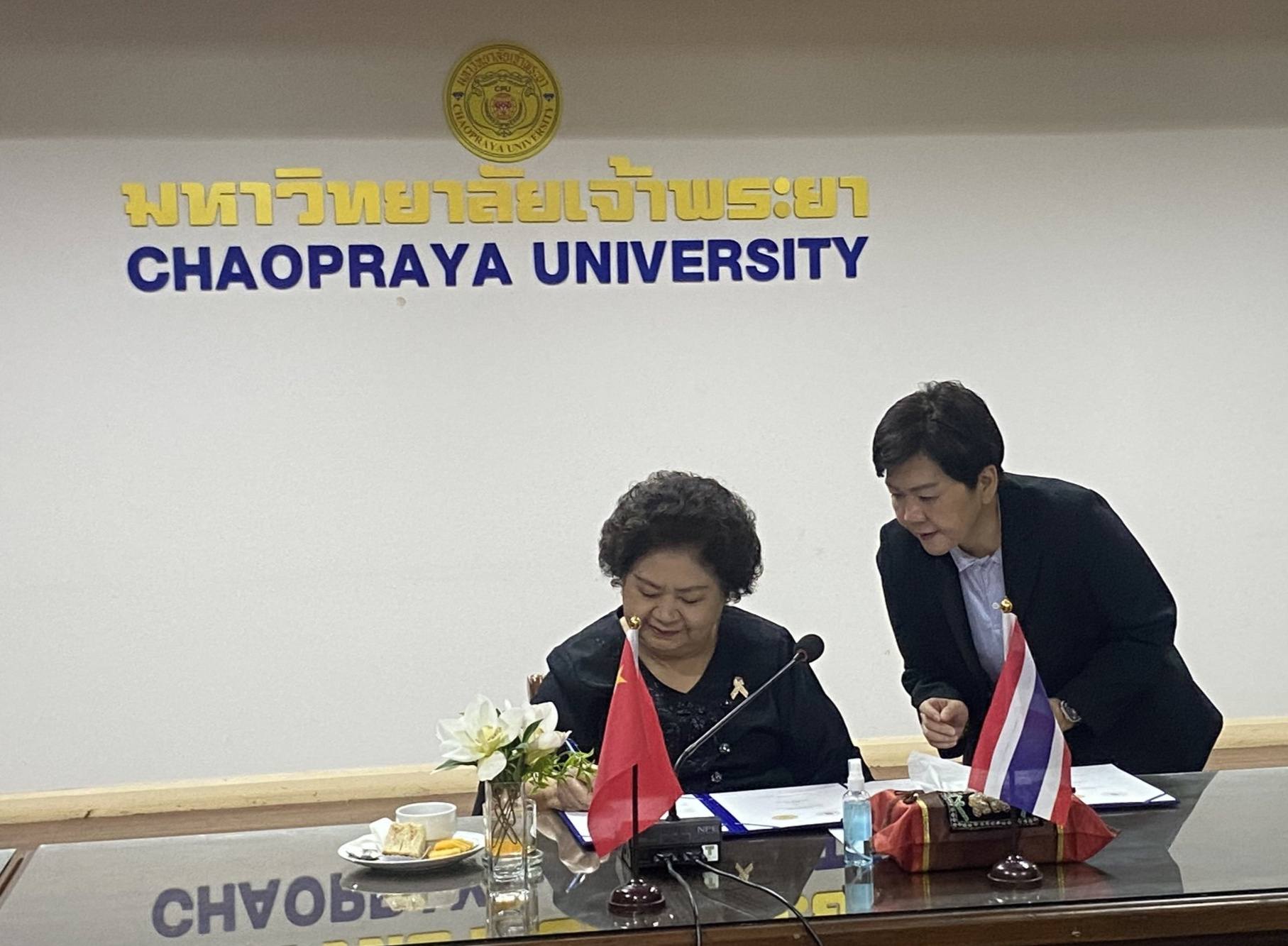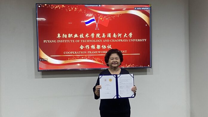 ดร.ดารัตน์ ศิริวิริยะกุล วิภาตะกลัศ  อธิการบดีมหาวิทยาลัยเจ้าพระยา พร้อมด้วยคณะผู้บริหาร ได้ร่วมพิธีลงนามบันทึกข้อตกลงความร่วมมือทางวิชาการ (Memorandum of Understanding: MOU) ร่วมกับ Fuyang Institute of Technology สาธารณรัฐประชาชนจีน โดย ผู้ช่วยศาสตราจารย์ ดร. Wenqing Hao อธิการบดีและรองเลขาธิการคณะกรรมการพรรคคอมมิวนิสต์แห่งสาธารณรัฐประชาชนจีน พร้อมด้วยคณะผู้บริหาร ได้ให้เกียรติเข้าร่วมในพิธีดังกล่าว ซึ่งนับเป็นก้าวสำคัญในการเริ่มต้นความร่วมมือทางวิชาการระหว่างสองสถาบันอย่างเป็นทางการ เมื่อวันพุธที่ 14 มกราคม พ.ศ. 2569  ณ ห้องรับรองริมน้ำ ศูนย์ประชุมมหาวิทยาลัยเจ้าพระยา ภายใต้กรอบความร่วมมือนี้ ทั้งสองสถาบันได้กำหนดจัดกิจกรรมทางวิชาการร่วมกัน โดยกิจกรรมแรกคือ โครงการอบรมทักษะอากาศยานไร้คนขับ (Drone Skills Training Program) ซึ่งจะจัดขึ้น ณ มหาวิทยาลัยเจ้าพระยา ในช่วงเดือนมีนาคม พ.ศ. 2569 ทั้งนี้ ผู้เข้ารับการอบรมจะได้รับ ใบประกาศนียบัตร (Certificate) จาก Fuyang Institute of Technology และมหาวิทยาลัยเจ้าพระยาภายหลังสำเร็จการอบรม