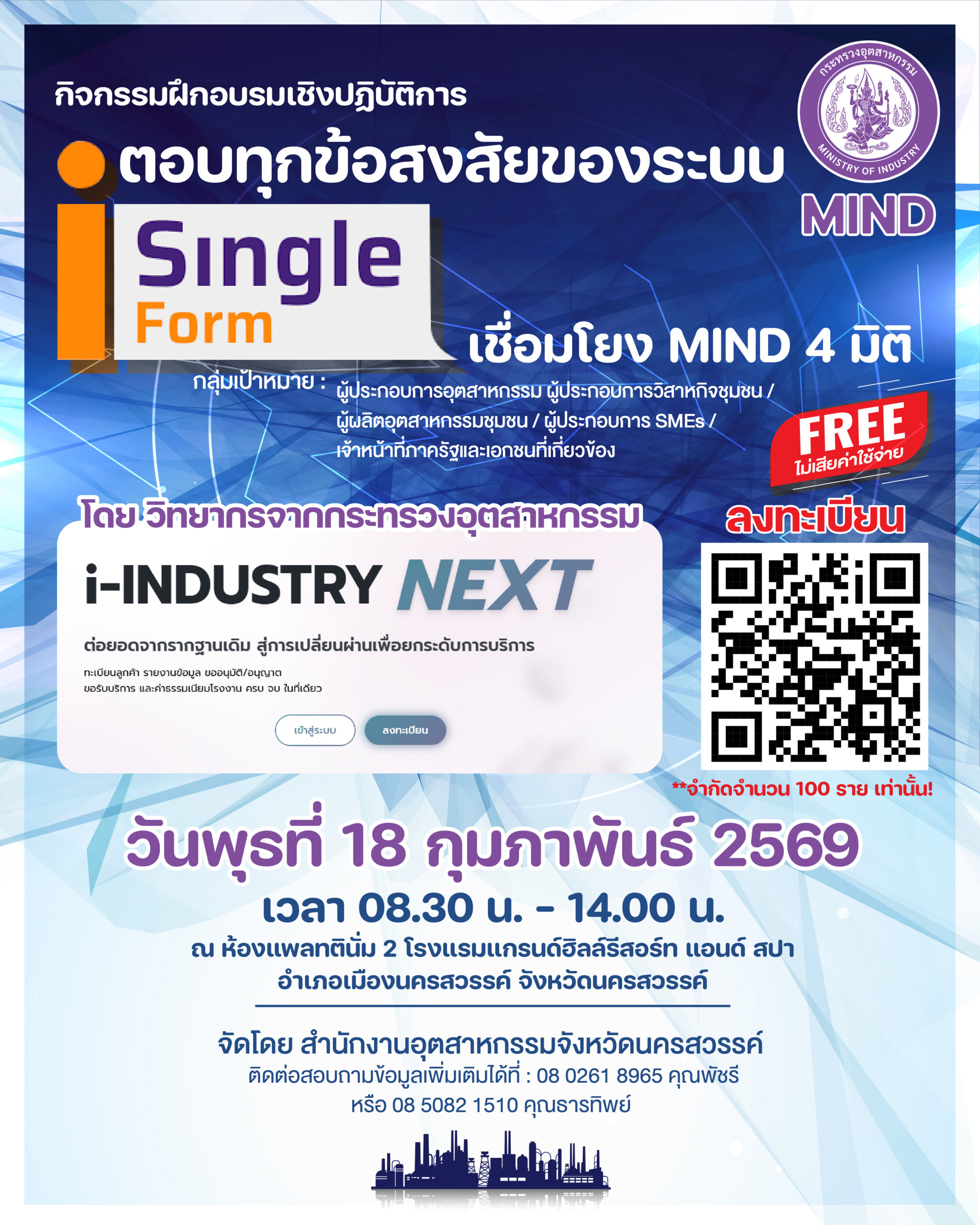 …………………………………… @โครงการดีๆ สำหรับผู้ประกอบการในจังหวัดนครสวรรค์ สำนักงานอุตสาหกรรมจังหวัดนครสวรรค์ จัดอบรมเชิงปฏิบัติการ เรื่อง “ตอบทุกข้อสงสัยของระบบ iSingleForm เชื่อมโยง MIND 4 มิติ” โดยวิทยากรจากกระทรวงอุตสาหกรรม ในวันพุธที่ 18 กุมภาพันธ์ 2569 เวลา 08.30 – 14.00 นาฬิกา ณ ห้องแพลทตินั่ม 2 โรงแรมแกรนด์ฮิลล์ รีสอร์ท แอนด์ สปา นครสวรรค์