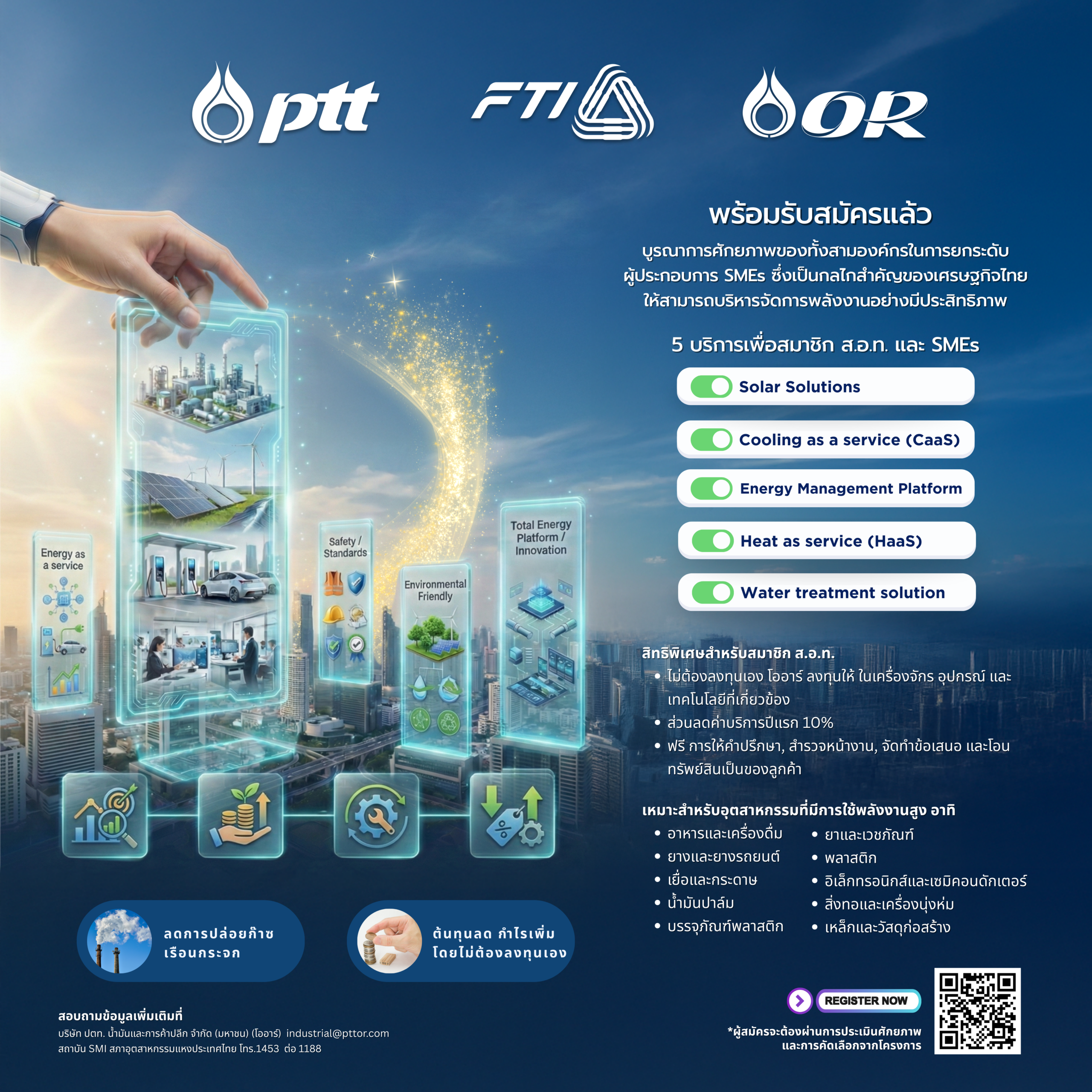 …………………………………… @ พร้อมรับสมัครแล้ว! โอกาสลดต้นทุนพลังงานสำหรับ SMEs สภาอุตสาหกรรมฯ ร่วมกับ PTT และ OR ยกระดับผู้ประกอบการ SME ด้วยโซลูชันพลังงานครบวงจร ไม่ต้องลงทุนเอง แต่ช่วย ลดต้นทุน เพิ่มกำไร และลดคาร์บอน