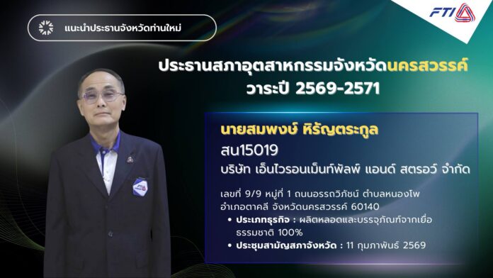 ผู้อ่านสวรรค์นิวส์และสมาชิกสภาอุตสาหกรรมจังหวัดนครสวรรค์…………………………………….. @ สภาอุตสาหกรรมจังหวัดนครสวรรค์ ขอแสดงความยินดีกับ นายสมพงษ์ หิรัญตระกูล ผู้แทนบริษัท เอ็นไวรอนเม็นท์พัลพ์ แอนด์ สตรอว์ จำกัด (EPAS) เลขที่สมาชิก สน15019 ที่ได้ดำรงตำแหน่งประธานสภาอุตสาหกรรมจังหวัดนครสวรรค์ วาระปี 2569 – 2571 และคณะกรรมการสภาอุตสาหกรรมจังหวัดนครสวรรค์ วาระปี 2569 -2571 (ชุดใหม่) ทั้ง 24 คน