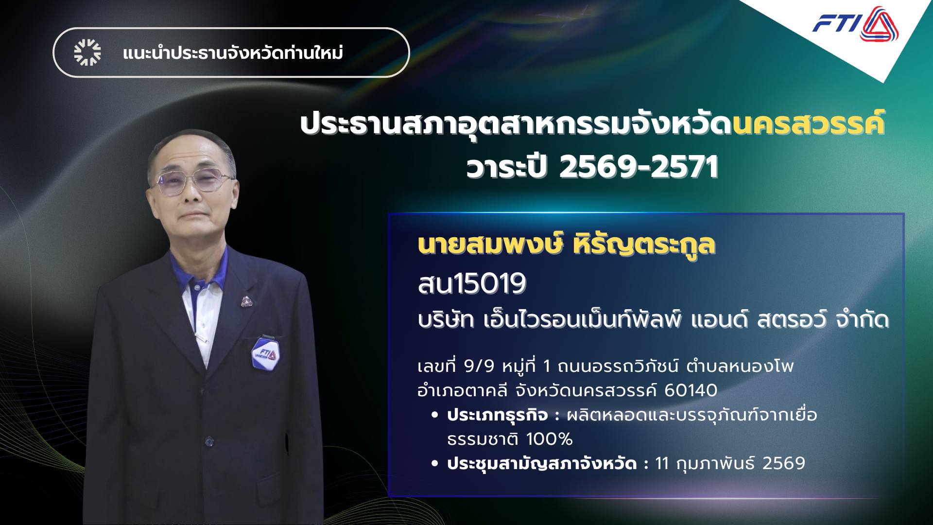ดร.ดารัตน์ ศิริวิริยะกุล วิภาตะกลัศ รองประธานสภาอุตสาหกรรมแห่งประเทศไทย ประธานอาวุโสสภาอุตสาหกรรมจังหวัดนครสวรรค์ ทันตแพทย์สุพจน์ หวังปรีดาเลิศกุล ประธานสภาอุตสาหกรรมภาคเหนือ พร้อมด้วยสมาชิกสภาอุตสาหกรรมจังหวัดนครสวรรค์ แสดงความยินดีกับ สมพงษ์ หิรัญตระกูล ผู้แทนบริษัท เอ็นไวรอนเม็นท์พัลพ์ แอนด์ สตรอว์ จำกัด (EPAS) เลขที่สมาชิก สน15019 ในโอกาสได้รับเลือกให้ดำรงตำแหน่งประธานสภาอุตสาหกรรมจังหวัดนครสวรรค์ วาระปี 2569-2571 เมื่อวันพุธที่ 11 กุมภาพันธ์ 2569 ในการประชุมสามัญประจำปี 2569 ณ ห้องลักษมีเทวี โรงแรมแกรนด์วิษณุ นครสวรรค์