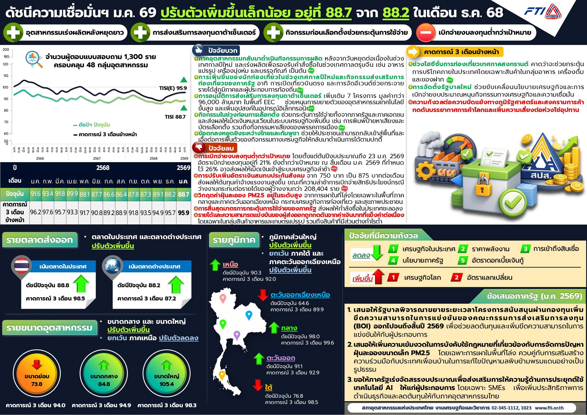 เมื่อวันพุธที่ 18 กุมภาพันธ์ 2569 นายนาวา จันทนสุรคน รองประธานสภาอุตสาหกรรมแห่งประเทศไทย (ส.อ.ท.) พร้อมด้วย ดร.วิรัช ฉัตรดรงค์ กรรมการ ส.อ.ท. และรองประธานสายงานเศรษฐกิจและวิชาการ ส.อ.ท. ร่วมเปิดเผยผลการสำรวจดัชนีความเชื่อมั่นภาคอุตสาหกรรมในเดือนมกราคม 2569 ซึ่งอยู่ที่ระดับ 88.7 ปรับตัวเพิ่มขึ้นจากระดับ 88.2 ในเดือนธันวาคม 2568