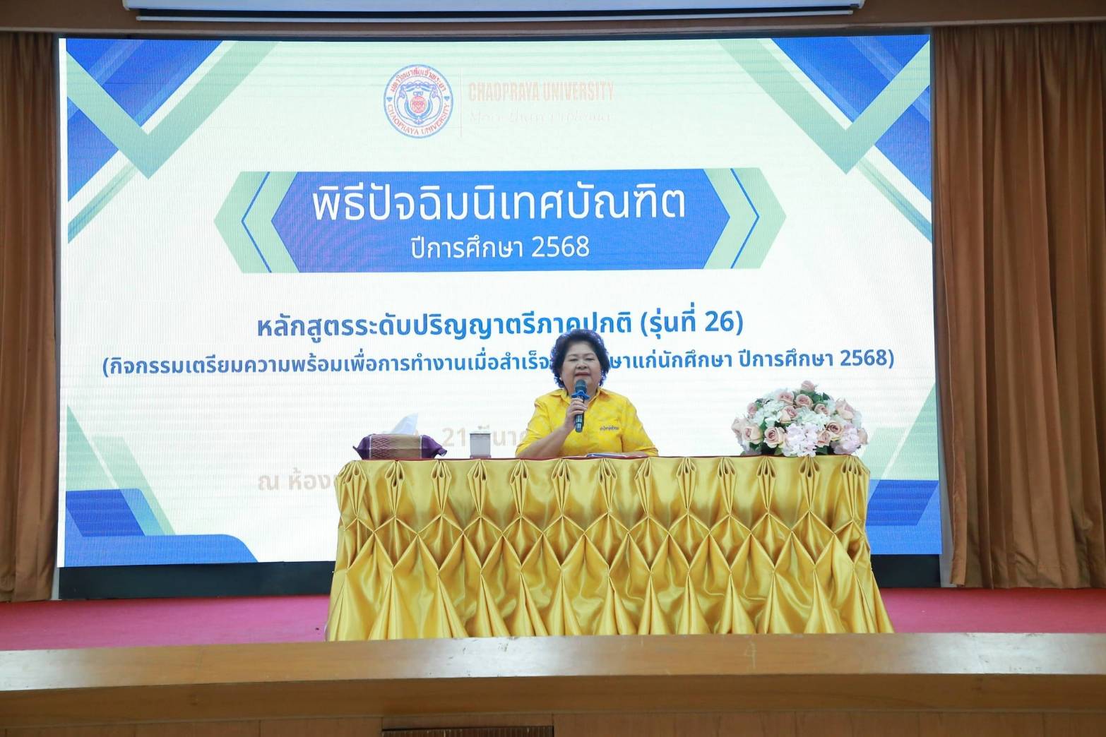 มหาวิทยาลัยเจ้าพระยา  โดยสำนักส่งเสริมวิชาการ  จัดกิจกรรม“ปัจฉิมนิเทศบัณฑิต รุ่น ที่ 26  ประจำปีการศึกษา 2568ณ  ห้องประชุมประพันธ์ศิริ  เมื่อวันศุกร์-เสาร์ที่20-21 มีนาคม 2569  โดยดร.ดารัตน์  ศิริวิริยะกุล  วิภาตะกลัศ  อธิการบดีมหาวิทยาลัยเจ้าพระยา เป็นประธานพิธีกล่าวให้โอวาทให้กับนักศึกษาที่จบการศึกษา ปีการศึกษา 2568  ต่อเนื่องด้วยกิจกรรมเสวนา “คนดี เพชรเจ้าพระยา”  โดยผู้แทนศิษย์เก่ามหาวิทยาลัยเจ้าพระยา มาร่วมเสวนาและถ่ายทอดประสบการณ์การเรียนรู้จากมหาวิทยาลัยเจ้าพระยาสู่คุณค่าการใช้ชีวิตในวงงานและสังคมให้แก่น้องๆที่กำลังจะจบการศึกษา และการบรรยายพิเศษ “ปั้นลุคให้โปร  สื่อสารให้ปัง พิชิตงานในโลกดิจิทัล” โดยอาจารย์ปรีดิยุข  รัตนงาม (ครูก้อง)  วิทยากรและผู้เชี่ยวชาญด้านบุคลิกภาพระดับประเทศ  บรรยายเรื่องการสื่อสารและการเตรียมตัวในเรื่องบุคลิกภาพที่ดี เพื่อนำไปปรับใช้ในการเตรียมตัวทำงานในอนาคตต่อไป