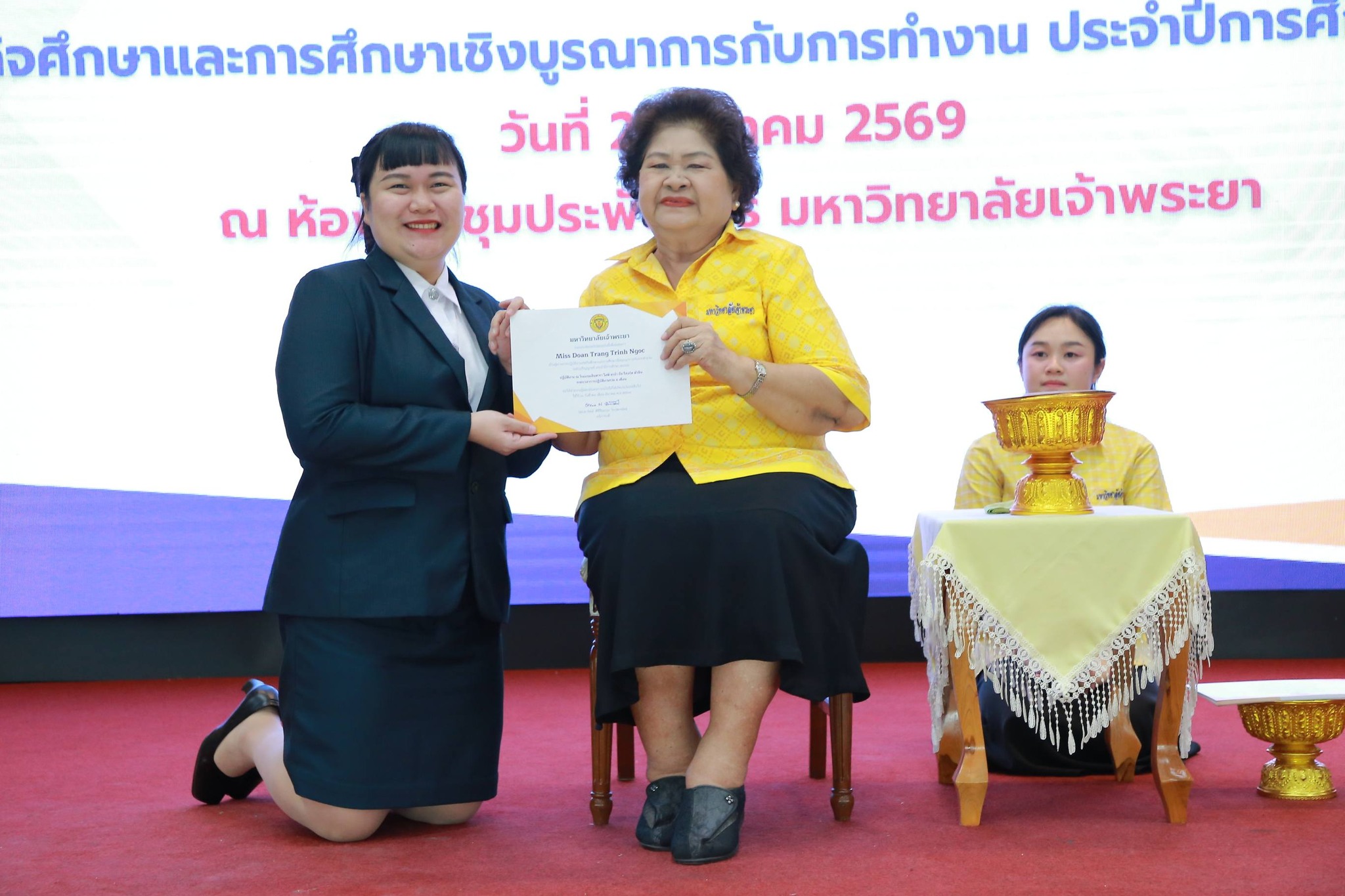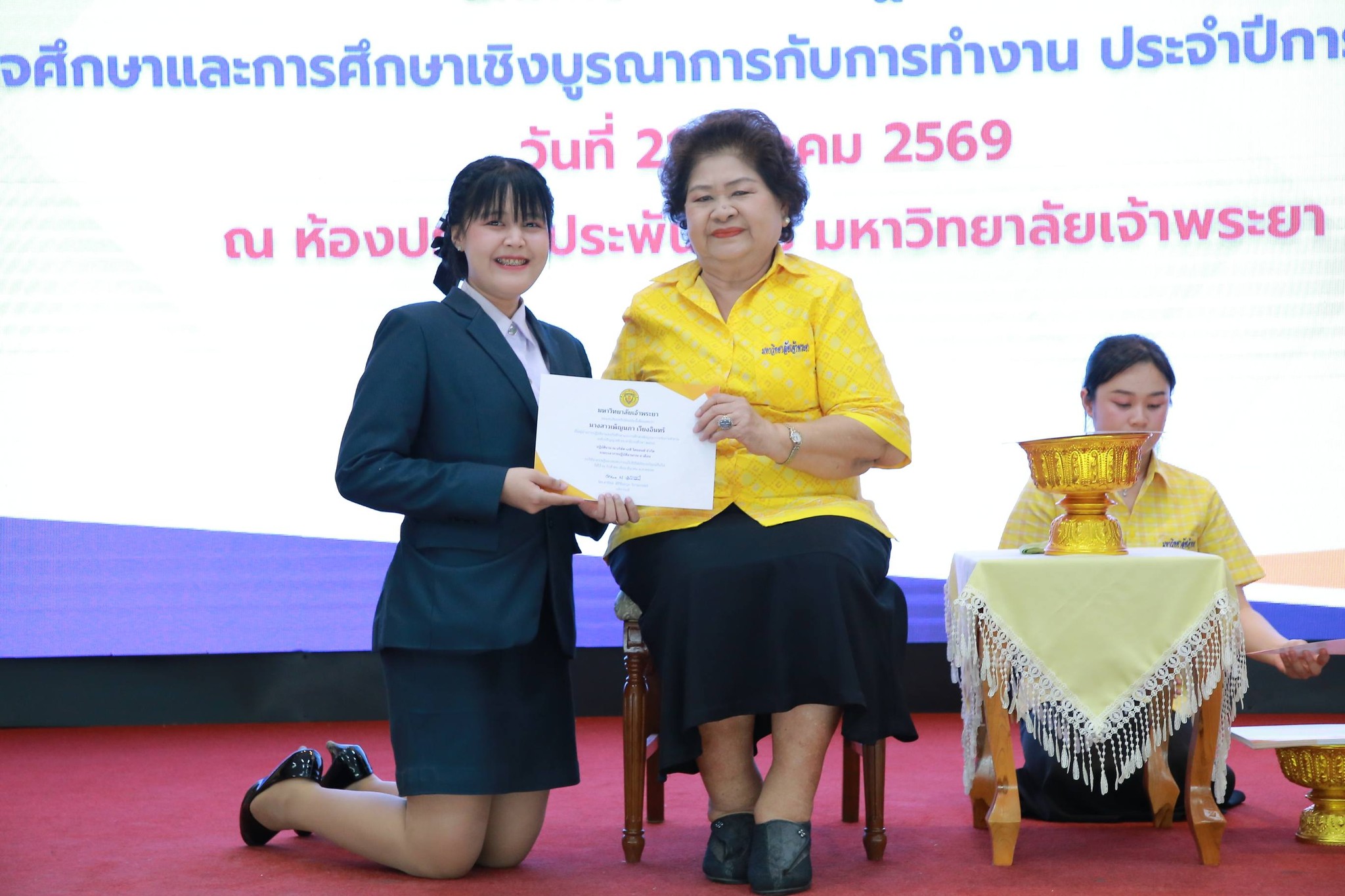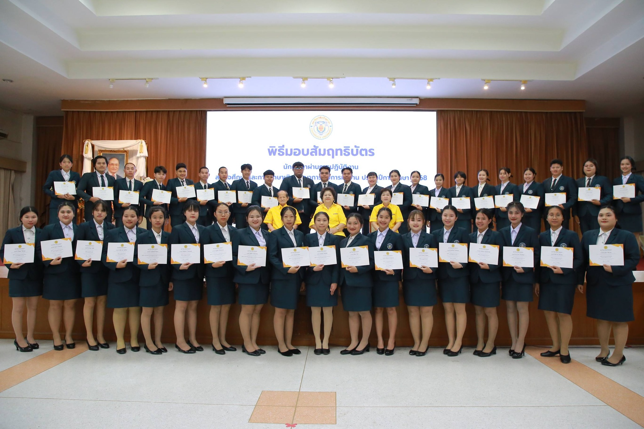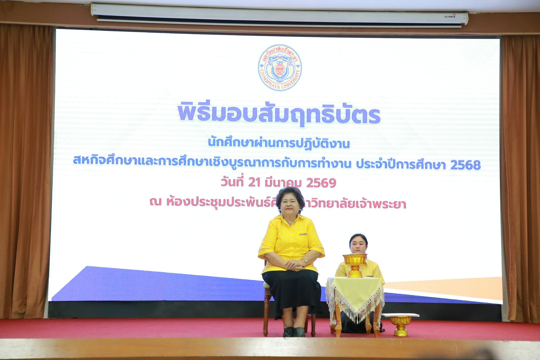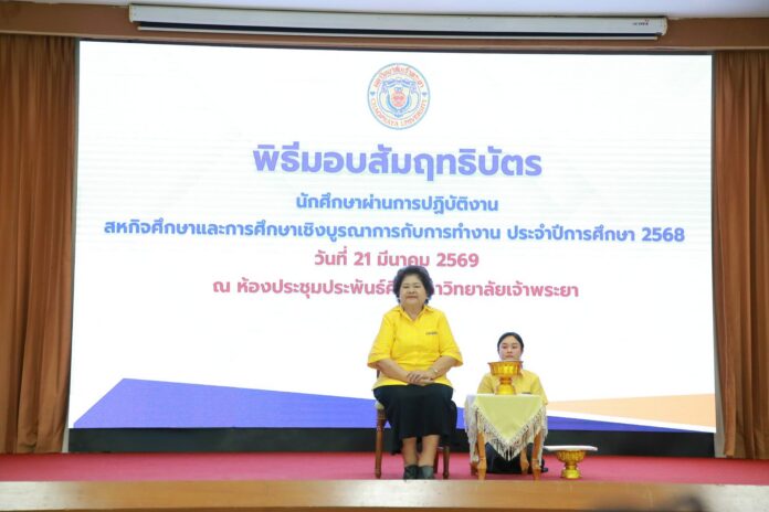ดร.ดารัตน์ ศิริวิริยะกุล วิภาตะกลัศ อธิการบดีมหาวิทยาลัยเจ้าพระยาให้เกียรติเป็นประธานในการมอบสัมฤทธิบัตรให้แก่นักศึกษาปฏิบัติงานสหกิจศึกษาและการศึกษาเชิงบูรณาการกับการทำงาน ( CWIE) ประจำปีการศึกษา 2568 เมื่อวันเสาร์ที่ 21 มีนาคม 2569 ณ ห้องประชุมประพันธ์ศิริ มหาวิทยาลัยเจ้าพระยา
