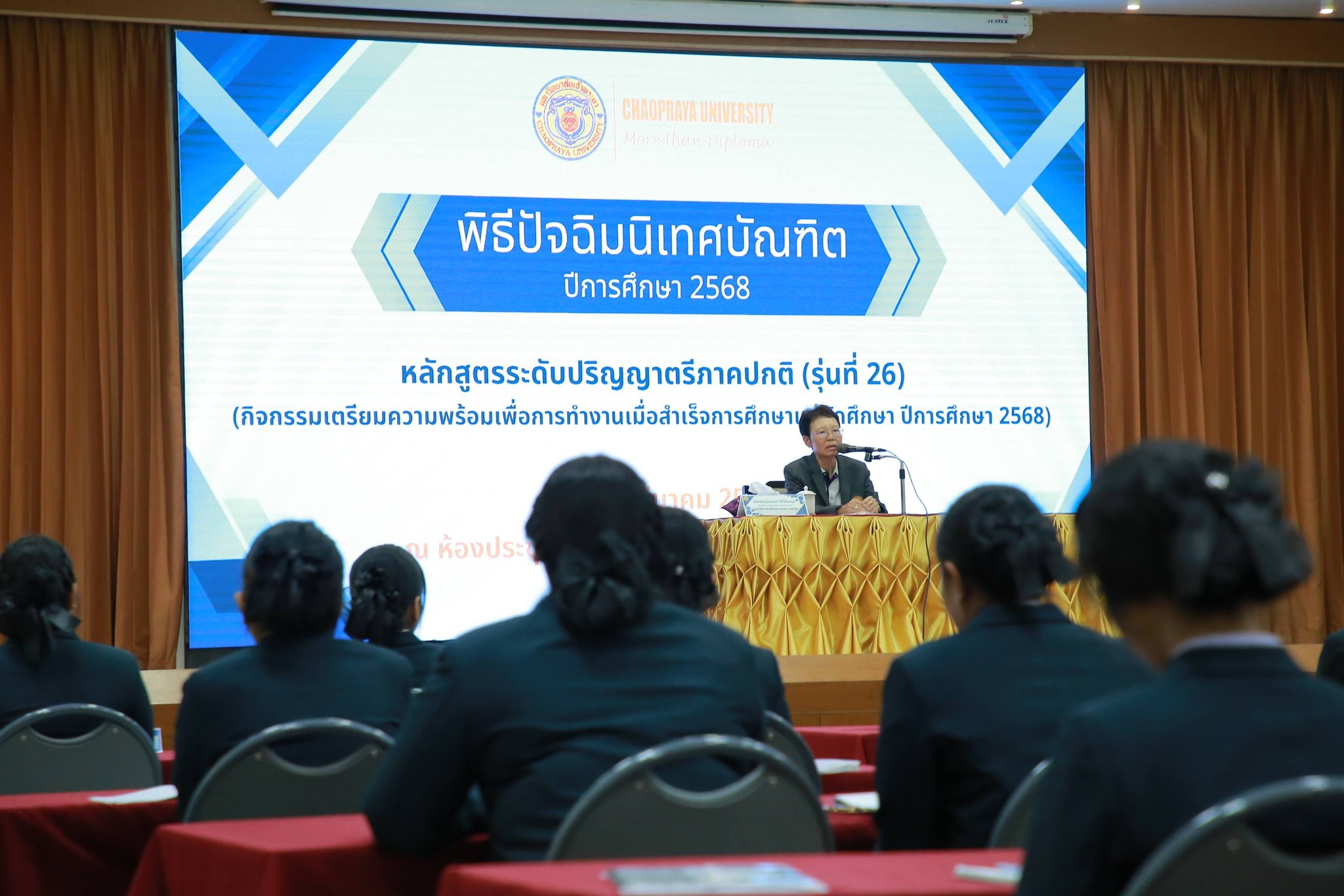 ดร.ดารัตน์  ศิริวิริยะกุล วิภาตะกลัศ อธิการบดีมหาวิทยาลัยเจ้าพระยา ให้เกียรติเป็นประธานเปิดงานปัจฉิมนิเทศบัณฑิต ปีการศึกษา 2568 (รุ่นที่ 26) โดยมี แพทย์หญิงปราณี  ศิริวิริยะกุล รองอธิการบดีฝ่ายการเงินการคลัง ร่วมให้ปัจฉิมโอวาท จากนั้นเป็นการเสวนาหลากหลายสาระเพื่อเตรียมความพร้อมเข้าสู่ชีวิตการทำงาน อาทิ การให้ข้อคิด “คนดี เพชรเจ้าพระยา ” โดยผู้แทนศิษย์เก่ามหาวิทยาลัยเจ้าพระยา  กิจกรรมเตรียมความพร้อมในการสัมภาษณ์งานในการบรรยายพิเศษ หัวข้อ The Professional Masterpiece : ปั้นลุคให้โปร สื่อสารให้ปัง พิชิตงานในโลกดิจิทัล ” โดย ปรีดิยุช  รัตนงาม(ครูก้อง) วิทยากรและผู้เชี่ยวชาญด้านบุคลิกภาพระดับประเทศ  การบรรยายพิเศษ หัวข้อ Career Navigator 2026 : สำรวจตนเองและวางเป้าหมายอาชีพ(lkigal) ให้สอดคล้องกับตลาดงานยุค Hybird ” โดย ผศ.ดร.กฤษณะ  ดาราเรือง คณบดีคณะบริหารและการจัดการมหาวิทยาลัยเจ้าพระยา และกิจกรรม AI Masterclass : ฝึกทักษะใช้ AI เป็นผู้ช่วยมือโปร” โดย ดร.ดาริน รุ่งกลิ่น และมัจรี สุพรรณ อาจารย์ประจำคณะบริหารและการจัดการมหาวิทยาลัยเจ้าพระยา  เป็นต้น  ส่งท้ายด้วยพิธีกตเวทิตาคารวะของว่าที่บัณฑิตด้วยความอบอุ่น ผูกพันและซาบซึ้งใจยิ่ง  ระหว่างวันศุกร์ที่ 20 ถึงวันเสาร์ที่ 21 มีนาคม 2569  ณ ห้องประชุมประพันธ์ศิริ มหาวิทยาลัยเจ้าพระยา