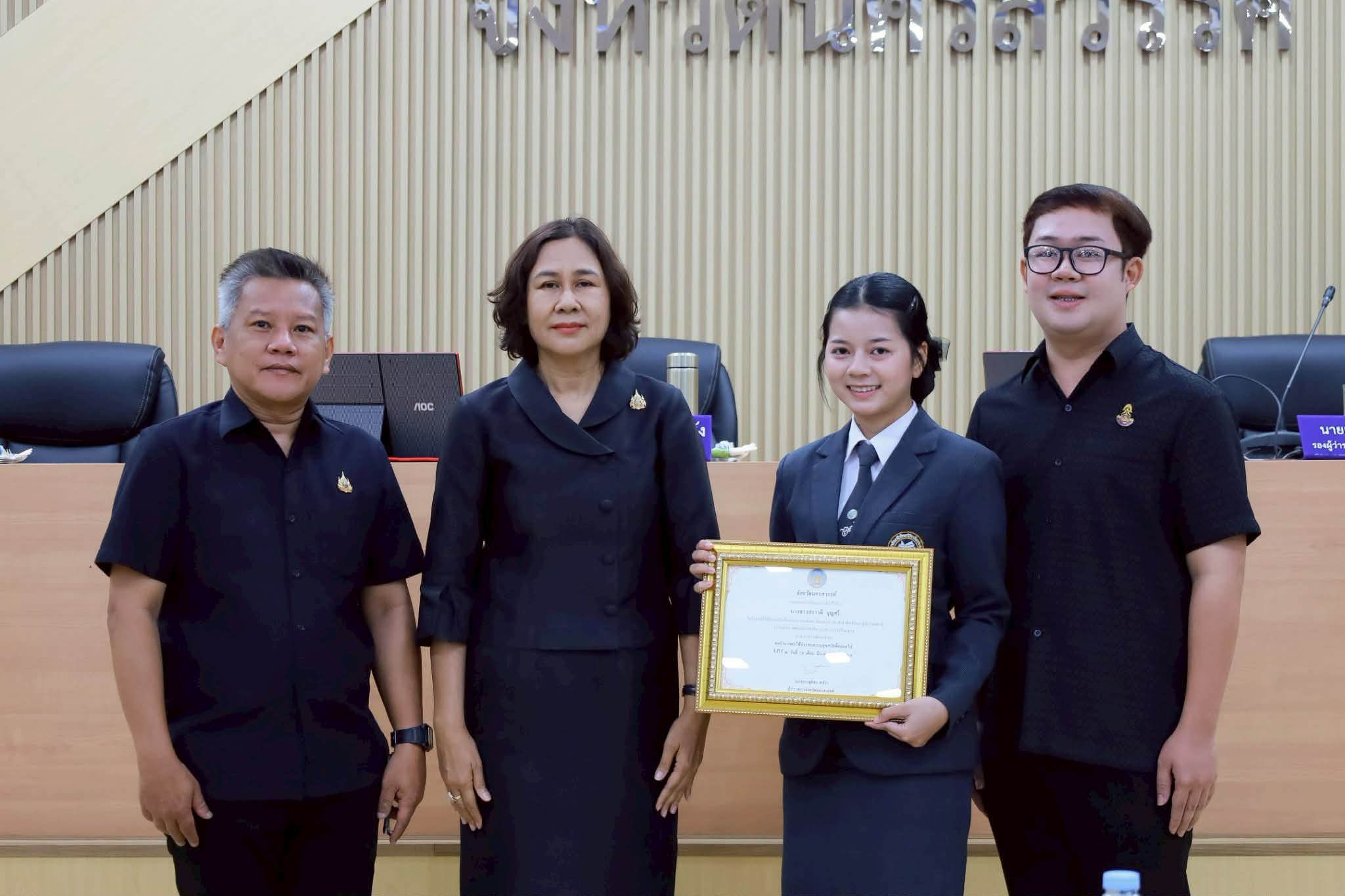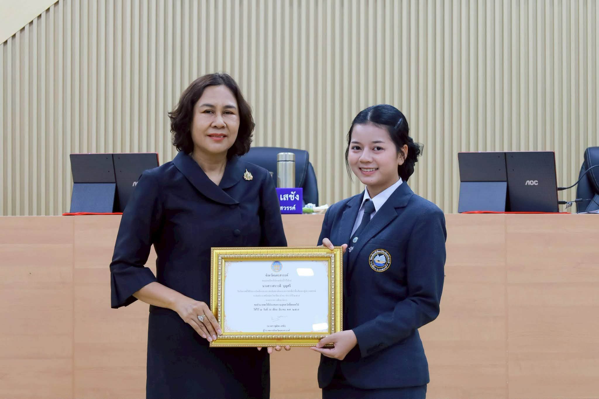 อาจารย์วรวุฒิ สุขเสวก ผู้อำนวยการวิทยาลัยอาชีวศึกษาวิริยาลัยนครสวรรค์ และอาจารย์วรชิต สิหิงษ์ รักษาการหัวหน้าสาขาวิชาการจัดการธุรกิจและการจัดการธุรกิจค้าปลีก นำนางสาวสราวดี บุญศรี นักศึกษาระดับประกาศนียบัตรวิชาชีพชั้นปีที่ 3 สาขาวิชาการบัญชี เข้ารับเกียรติบัตรเชิดชูเกียรติในฐานะเยาวชนที่สร้างชื่อเสียงมาสู่จังหวัดนครสวรรค์ จากการที่ได้รับรางวัลเด็กและเยาวชนดีเด่นที่นำชื่อเสียงมาสู่ประเทศชาติ ประจำปี 2569 จากกระทรวงศึกษาธิการ ทั้งนี้ได้รับเกียรติจาก นางสาวชุติพร เสชัง ผู้ว่าราชการจังหวัดนครสวรรค์ มอบเกียรติบัตรและกล่าวแสดงความยินดี เมื่อวันที่ 30 มีนาคม 2569 ณ ที่ประชุมกรมการจังหวัดนครสวรรค์ ศาลากลางจังหวัดนครสวรรค์