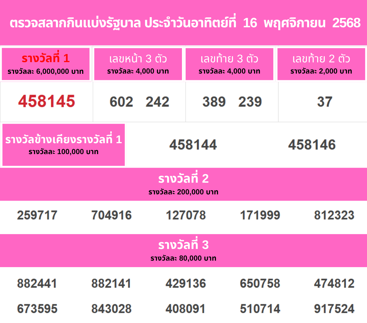 ตรวจสลากกินแบ่งรัฐบาล ประจำวันอาทิตย์ที่ 16 พฤศจิกายน 2568
