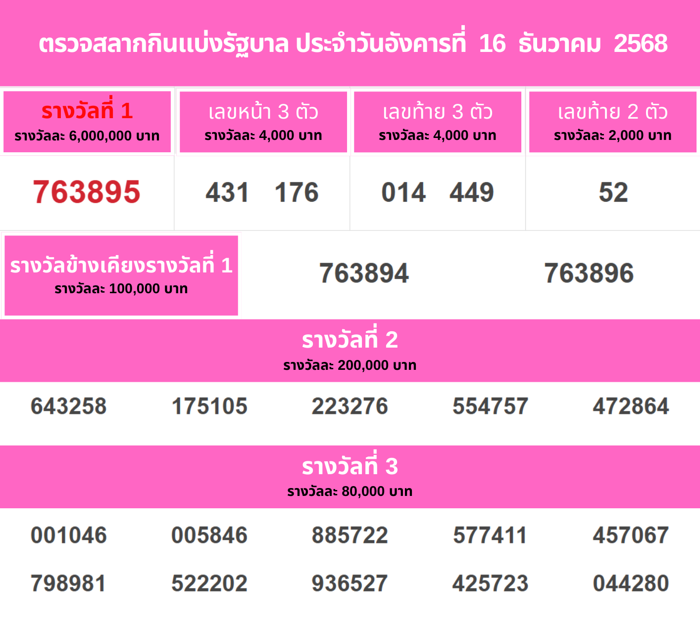 ตรวจสลากกินแบ่งรัฐบาล ประจำวันอังคารที่ 16 ธันวาคม 2568